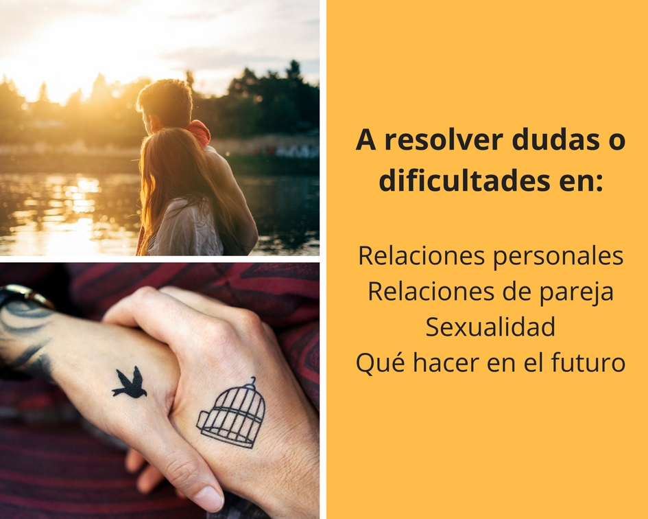 Jóvenes ¿Para qué acudir a terapia? Estoy ahí, al lado, para ayudarte, para escucharte, para resolver junt@s tus miedos. Tu problema es mío Pide cita
